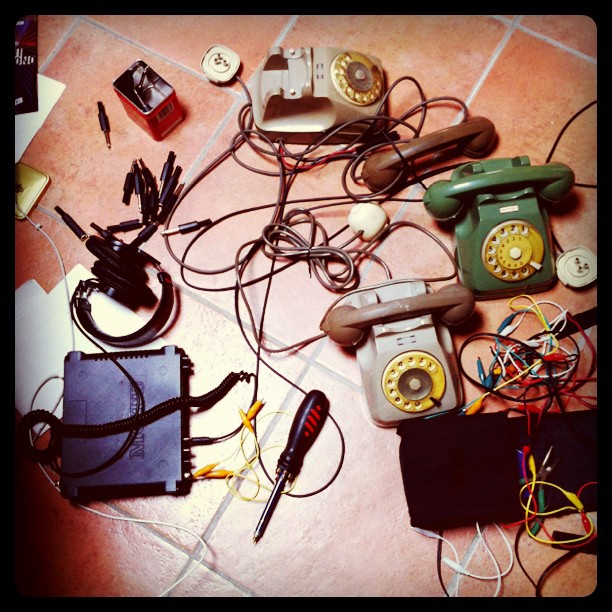 I will present the new “Machina logotelica”, an installation resulting from an assemblage of scavenged stuff (rumentarium style, ça va sans dire…), motors, hair driers, radioclocks. Custom hardware based on audio control will be used (thanks Guru Francesco Richiardi!)